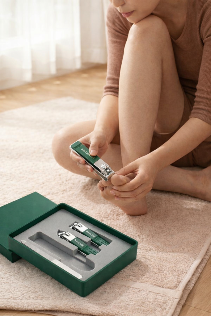 ClearNail est un protocole à domicile conçu pour accompagner les ongles abîmés ou mycosés légers à modérés. Il associe un appareil lumineux, un kit de préparation de l’ongle et un soin complémentaire dans une routine simple à suivre.